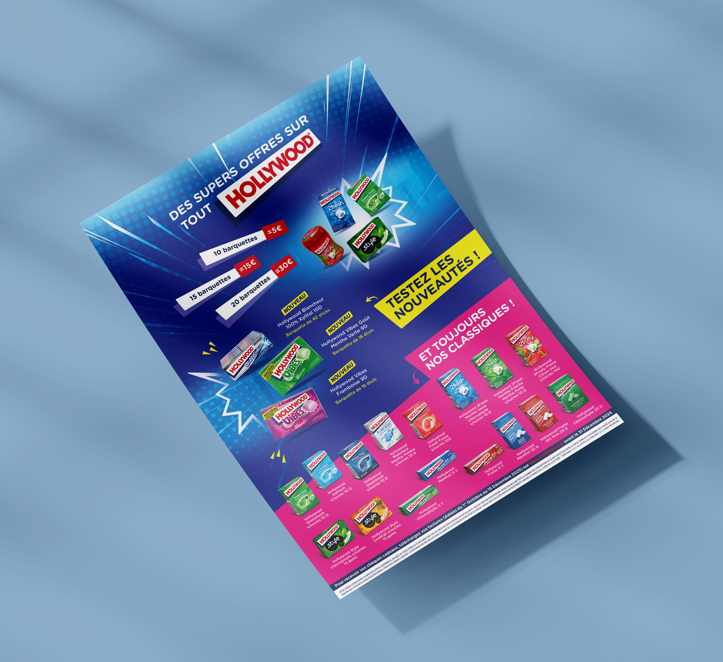 Hollywood, c’est le plaisir de mâcher version street et vitaminée. Nous accompagnons la marque dans ses activations terrain avec des visuels frais, toniques et parfaitement lisibles en linéaire. Offres flash, habillages PLV et ILV : on croque dans l’instant fraîcheur.