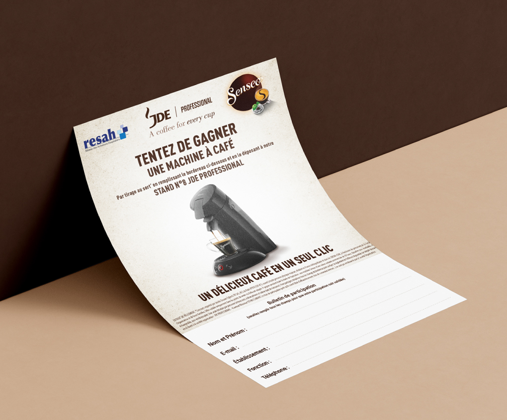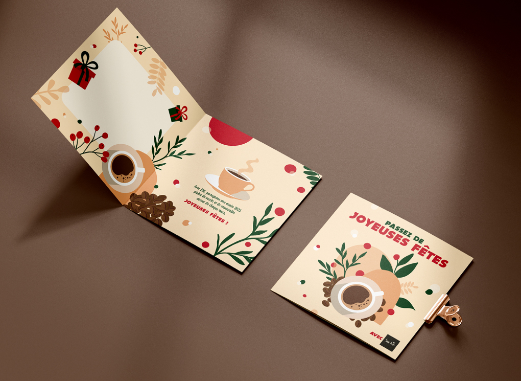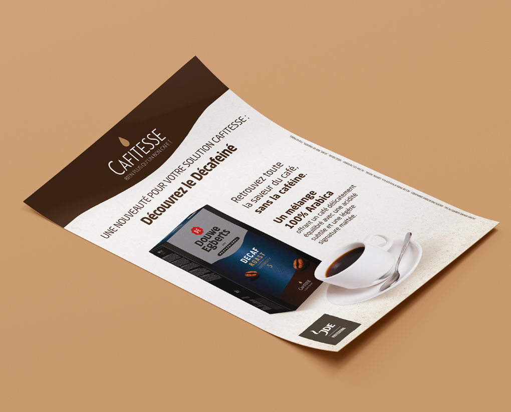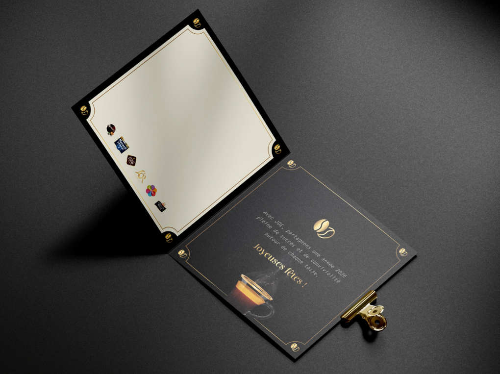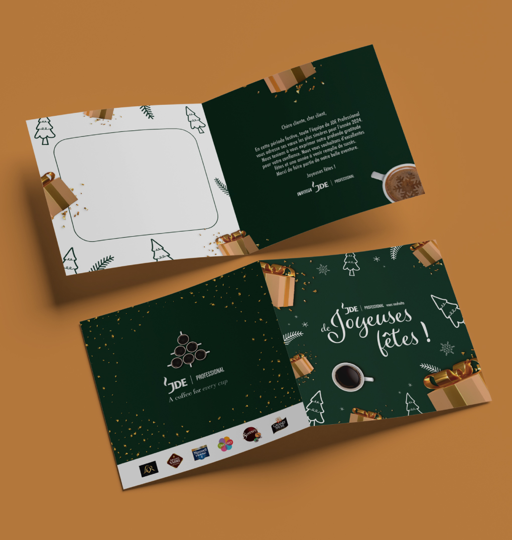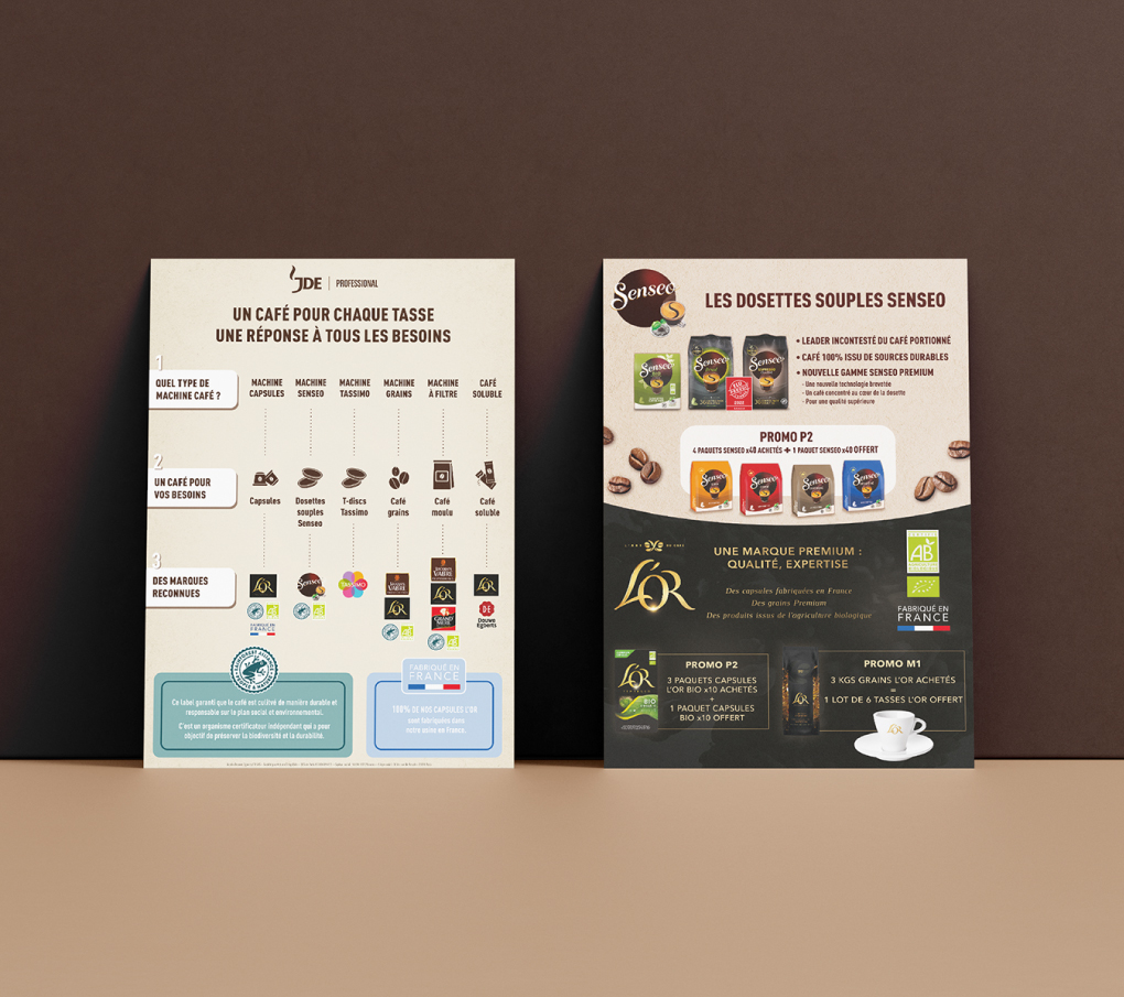 Nous accompagnons la marque JDE dans la conception et la réalisation de supports print, en veillant à respecter son identité et ses codes de marque.
